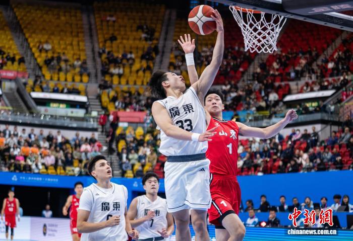 11月20日晚,第十五届全国男子U-22金牌篮球锦标赛在香港体育馆举行。广东队以103-75击败山东队夺得冠军。图为广东队球员杨毅(白球衣33号)在比赛中上篮得分。图片提供:华报记者侯宇。